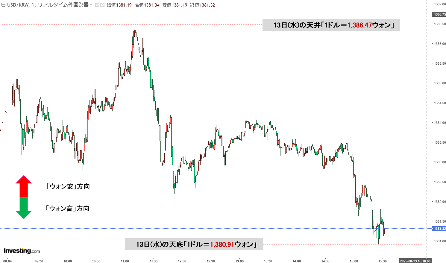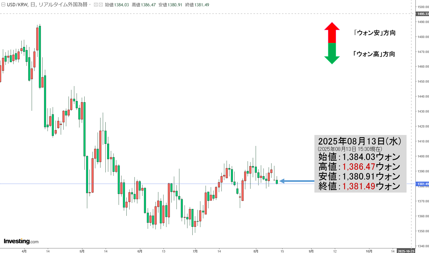 2025年08月13日(水)15:30現在、ドルウォンのチャートは以下のようになっています(チャートは『Investing.com』より引用)。