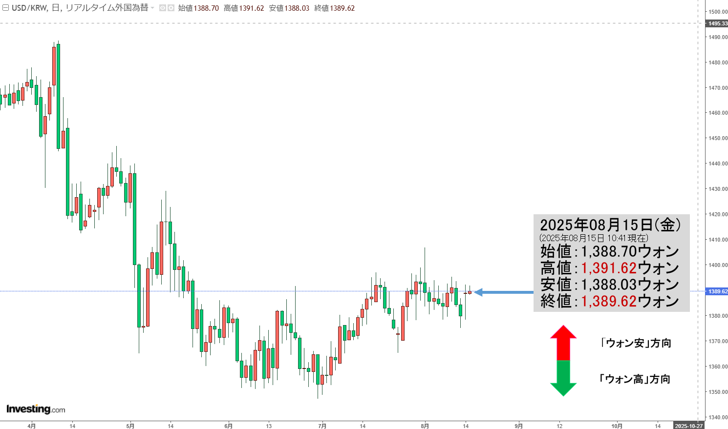 2025年08月15日(金)の韓国時間※が終わりました。15:30現在、ドルウォンのチャートは以下のようになっています(チャートは『Investing.com』より引用)。現在のところ「1ドル=1,390ウォン」近辺の攻防となっています。ロ…