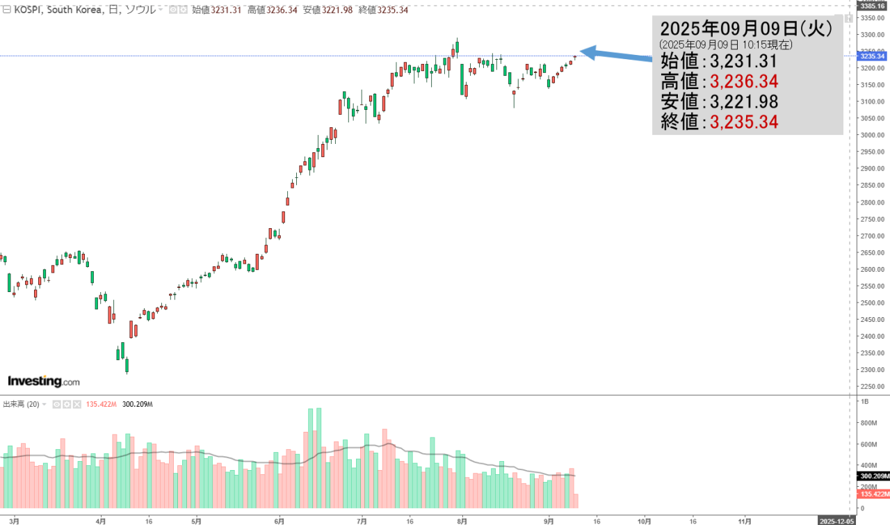 2025年09月09日(火)の韓国株式市場が開きました。10:15現在、KOSPI(韓国総合株価指数)のチャートは以下のようになっています(チャートは『Investing.com』より引用)。