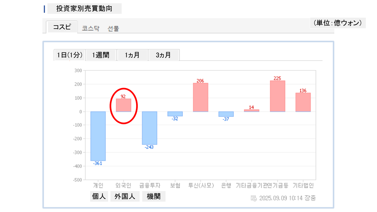 2025年09月09日(火)の韓国株式市場が締まりました。15:32現在、KOSPI(韓国総合株価指数)のチャートは以下のようになっています(チャートは『Investing.com』より引用)。投資家別売買動向は以下です。⇒データ引用元:『...