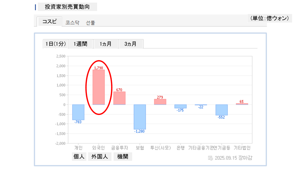 個人投資家は「783億ウォン」の売り越し。一方の外国人投資家は「1,798億ウォン」の買い越しです。