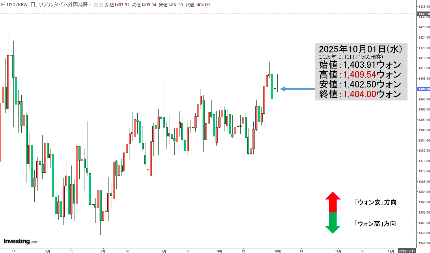 2025年10月02日(木)の市場が開きました。10:00現在、ドルウォンのチャートは以下のようになっています(チャートは『Investing.com』より引用)。現在のところ「1ドル=1,403ウォン」近辺の攻防となっています。ローソク足…