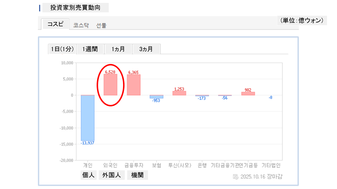個人投資家は「1兆3,940億ウォン」の売り越し。一方の外国人投資家は「6,527億ウォン」の買い越しです。