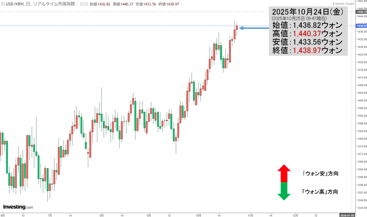 2025年10月24日(金)が(ほぼほぼ)締まりました。2025年10月25日 09:49現在、ドルウォンチャートは以下のようになっています(チャートは『Investing.com』より引用:以下同)。