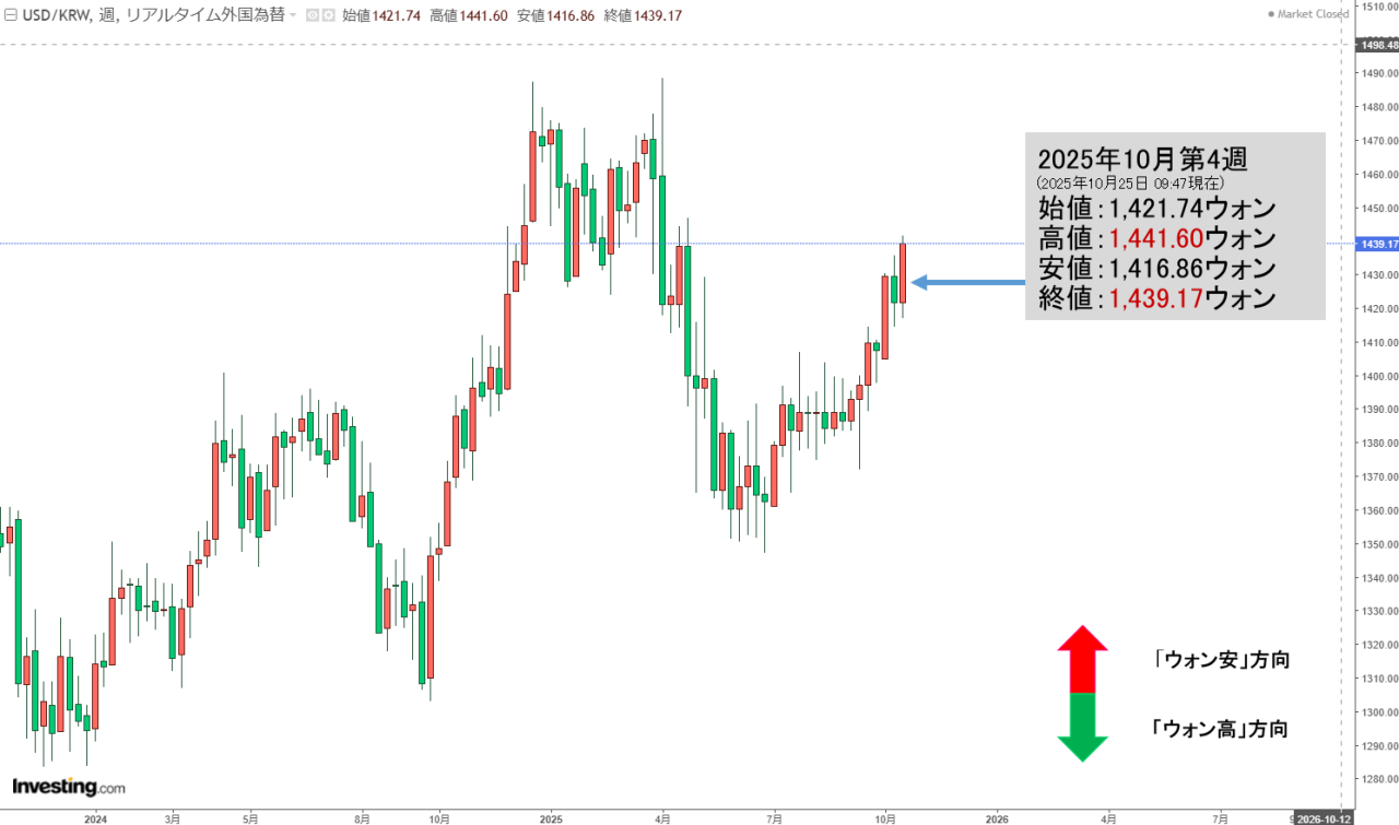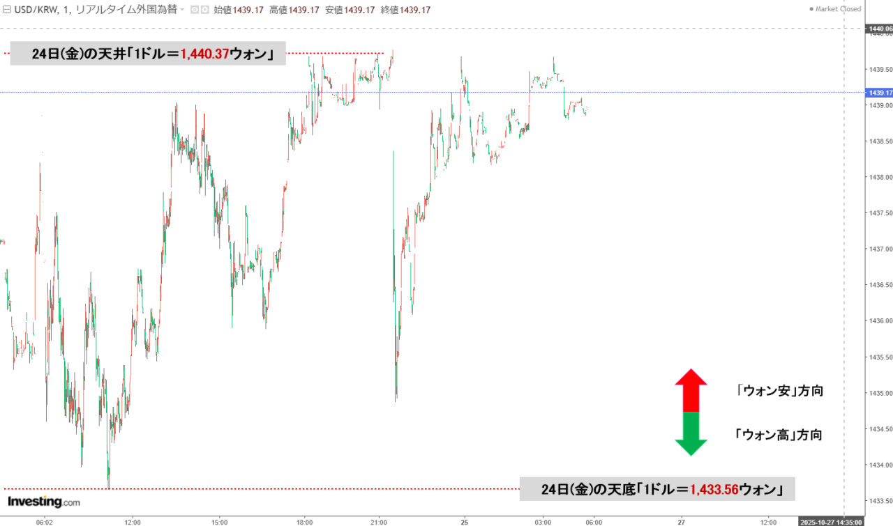 2025年10月27日(月)の市場が開きました。10:00現在、ドルウォンのチャートは以下のようになっています(チャートは『Investing.com』より引用)。陰線となっています。現在のところ「1ドル=1,432ウォン」近辺の攻防となっ...