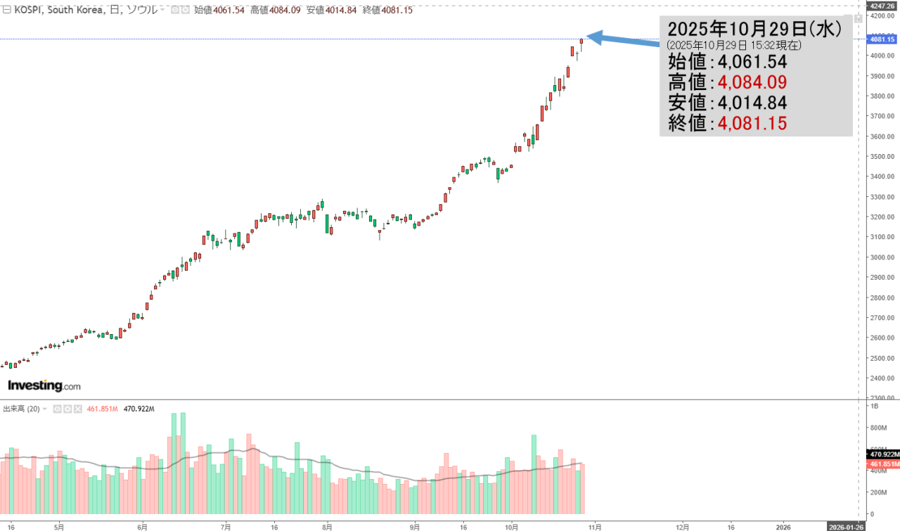2025年10月30日(木)の韓国株式市場が開きましたので、KOSPIチャートの初動状況を以下の記事にまとめました。本記事と併せてお読み頂ければ幸いです。
