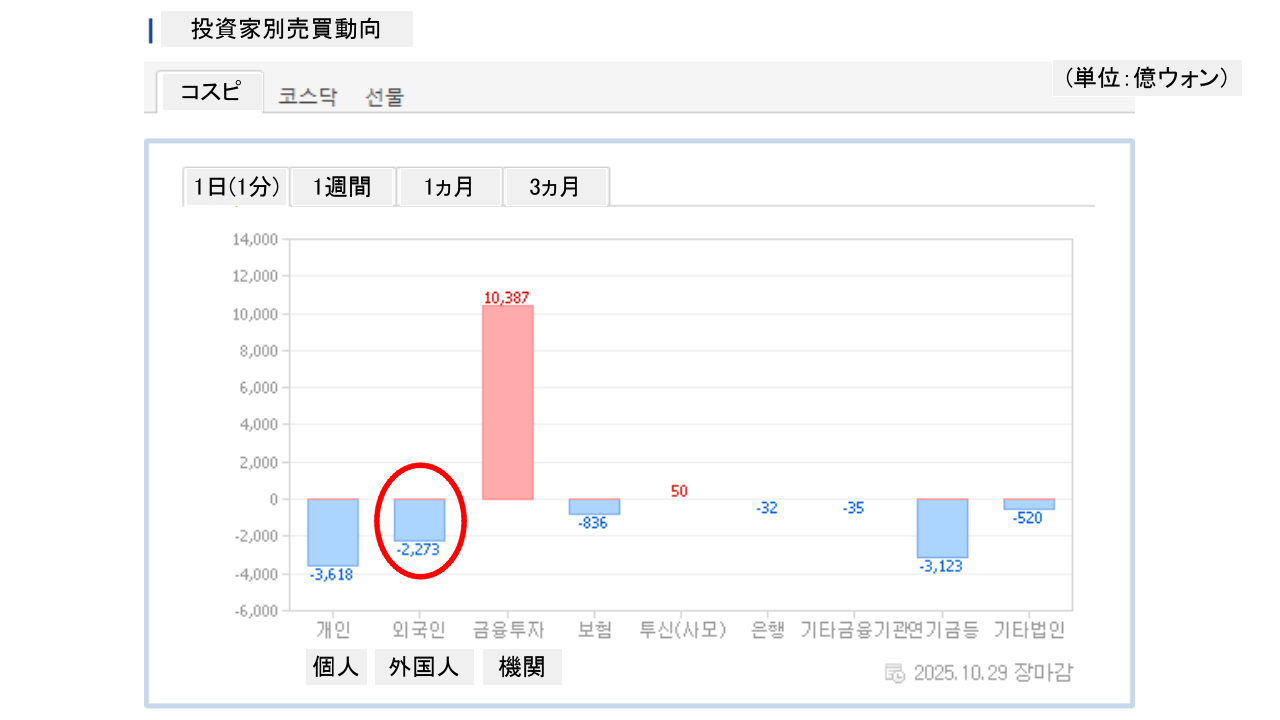 個人投資家は「3,618億ウォン」の売り越し。一方の外国人投資家は「2,273億ウォン」の売り越しです。