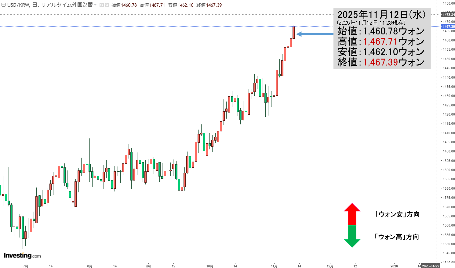 2025年11月12日(水)の市場が開きました。11:28現在、ドルウォンのチャートは以下のようになっています(チャートは『Investing.com』より引用)。