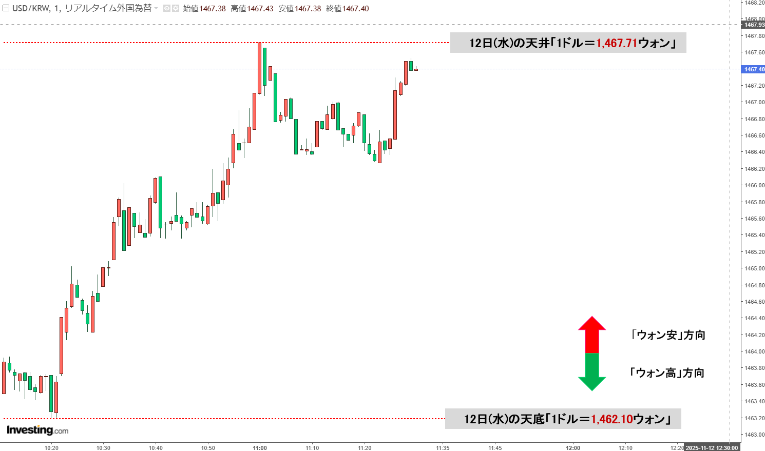 現在の天井は「1ドル=1,467.71ウォン」、天底は「1ドル=1,462.10ウォン」です。