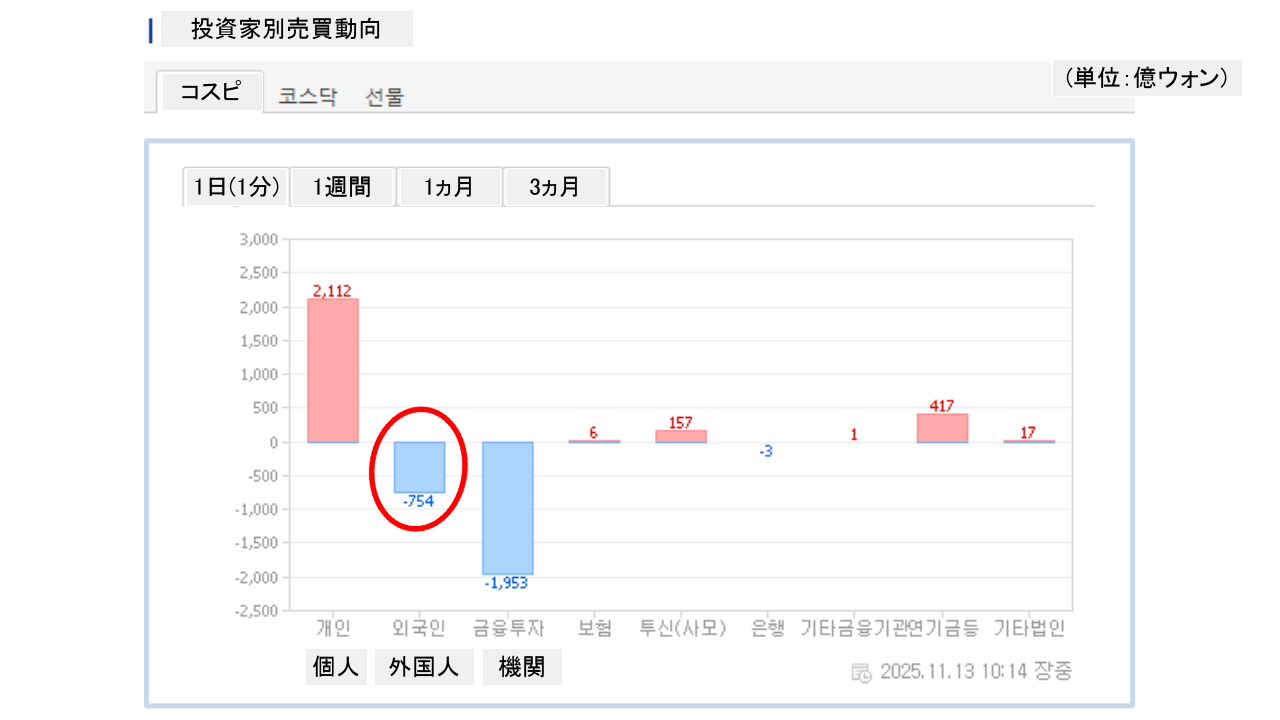 個人投資家は「2,112億ウォン」の買い越し。一方の外国人投資家は「754億ウォン」の売り越しです。