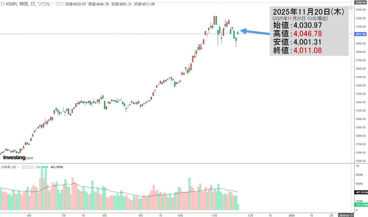 「韓国株式市場」11月20日(木)初動・KOSPI「4,011」ギャップアップ!