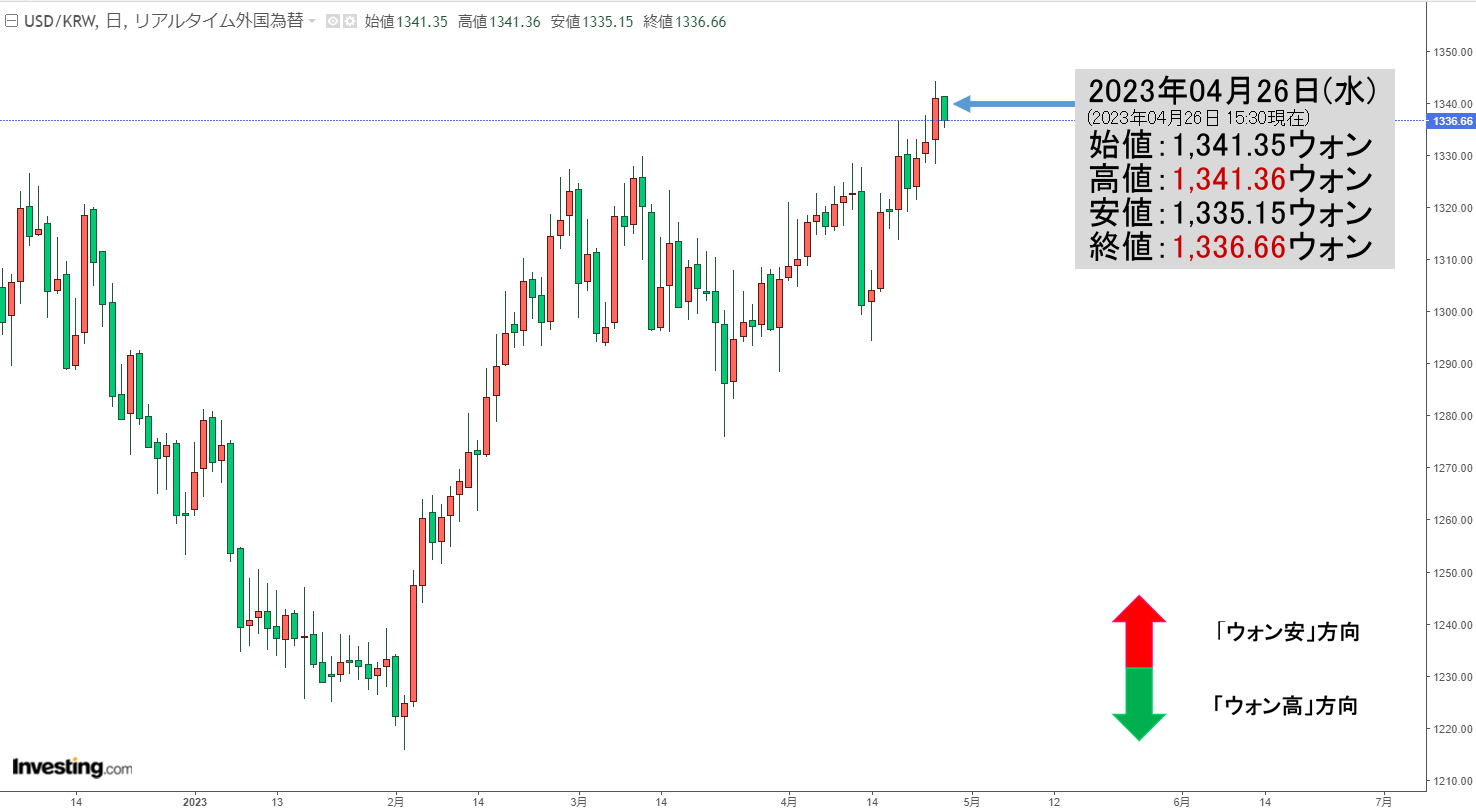 2023年04月26日(水)の韓国時間※が終わりました。15:30現在、ドルウォンのチャートは以下のようになっています(チャートは『Investing.com』より引用)。