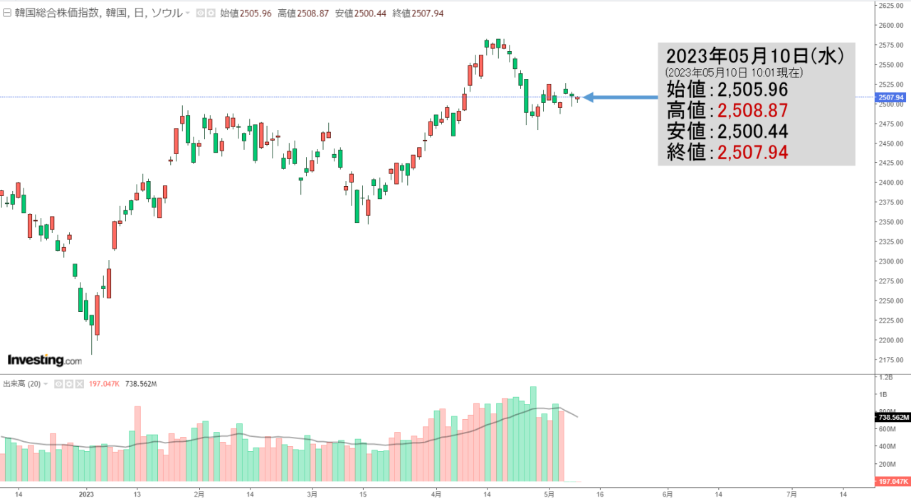2023年05月10日(水)の韓国株式市場が開きました。10:01現在、KOSPI(韓国総合株価指数)のチャートは以下のようになっています(チャートは『Investing.com』より引用)。