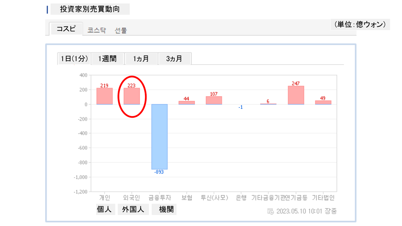 個人投資家は「219億ウォン」の買い越し。一方の外国人投資家は「223億ウォン」の買い越しです。