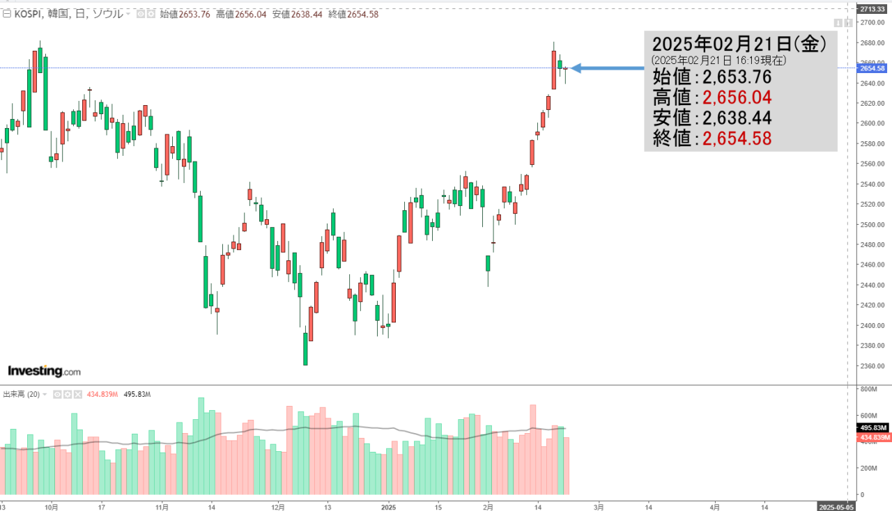 2025年02月21日(金)の韓国株式市場が締まりました。16:19現在、KOSPI(韓国総合株価指数)のチャートは以下のようになっています(チャートは『Investing.com』より引用)。