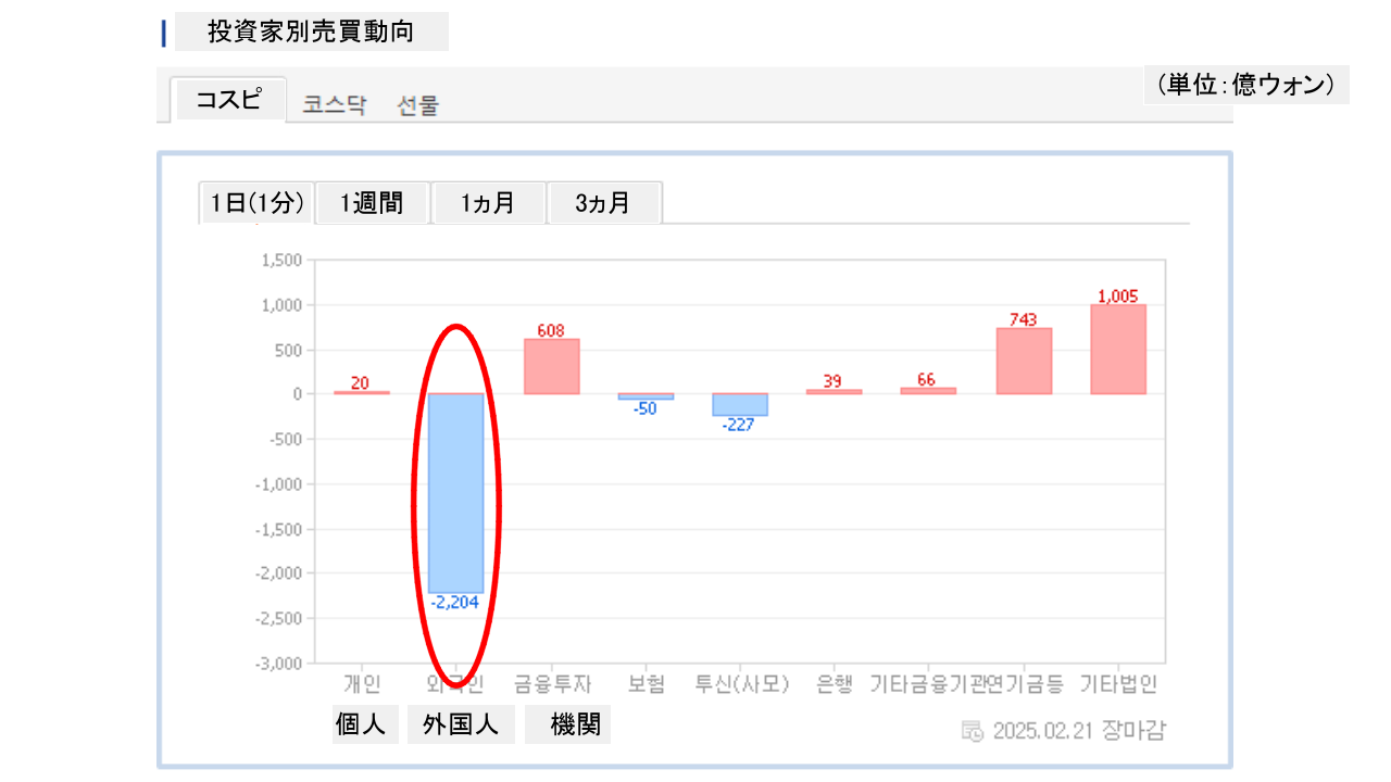 個人投資家は「20億ウォン」の買い越し。一方の外国人投資家は「2,204億ウォン」の売り越しです。