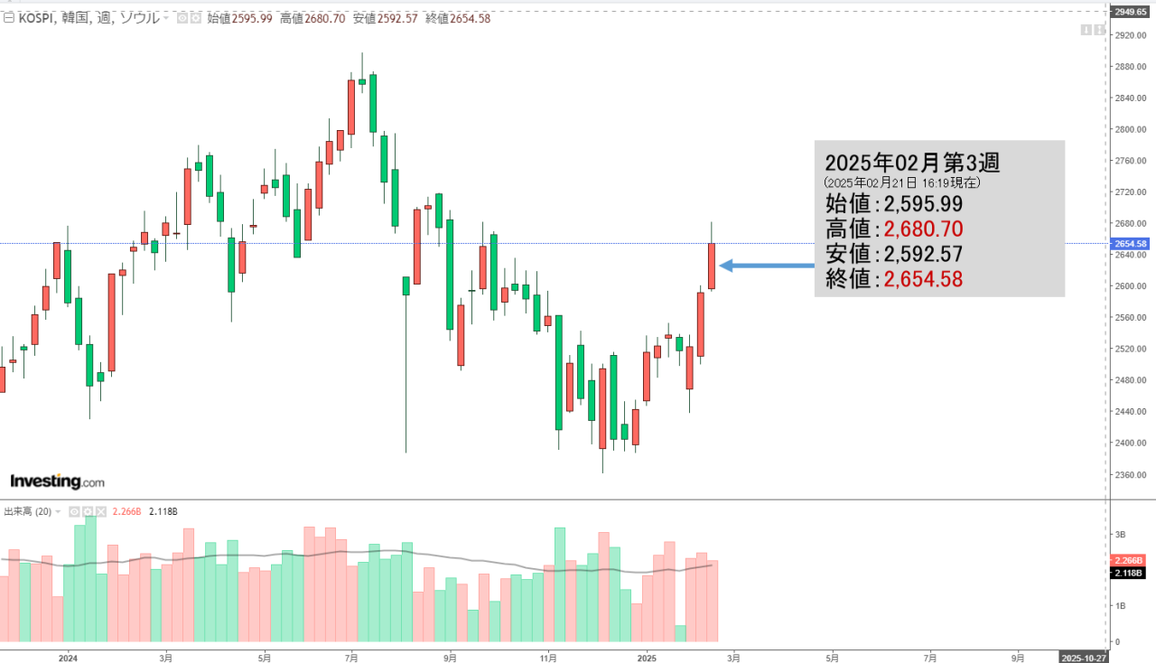 「韓国株式市場」02月24日(月)初動・KOSPI「2,633」ギャップダウン!