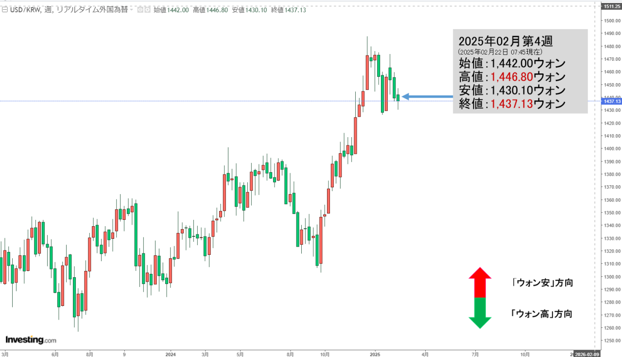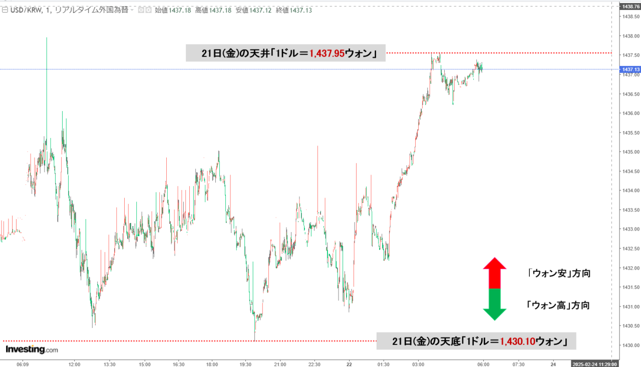 2025年02月21日(金)が(ほぼほぼ)締まりました。2025年02月22日 07:47現在、ドルウォンチャートは以下のようになっています(チャートは『Investing.com』より引用:以下同)。