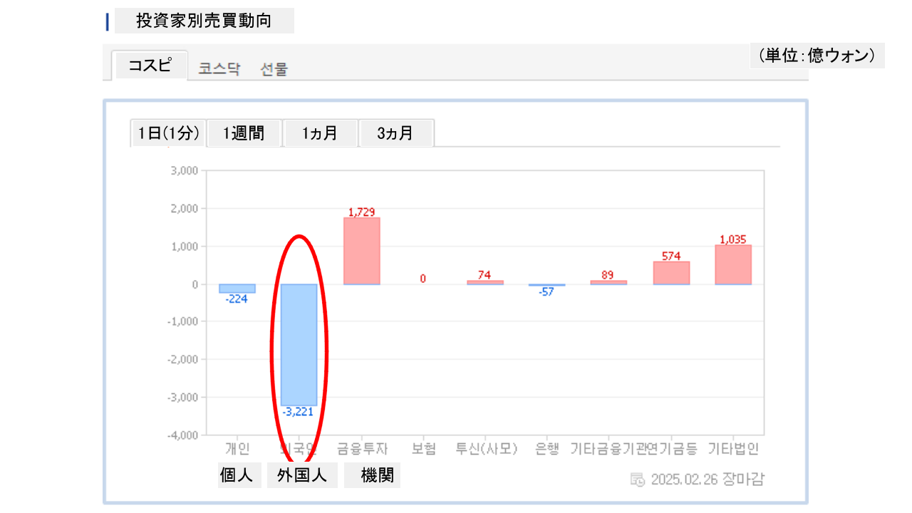 個人投資家は「224億ウォン」の売り越し。一方の外国人投資家は「3,221億ウォン」の売り越しです。