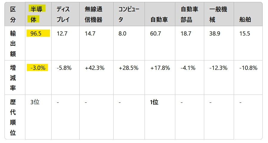半導体の輸出額が100億ドルを割り、対前年同期比でマイナスとなっています。