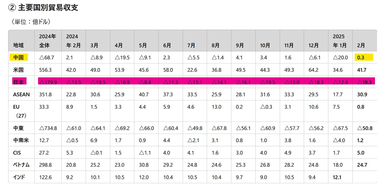 2025年02月はうっすいながらも「0.3億ドル」だけ黒字になりました。かってはボロ儲けしていた対中国貿易ですが、もはや黒字になる方が珍しいのが、韓国の現状なのです。