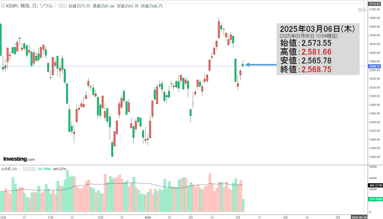 2025年03月06日(木)の韓国株式市場が締まりましたので以下の記事を制作いたしました。本記事と併せてお読み頂ければ幸いです。