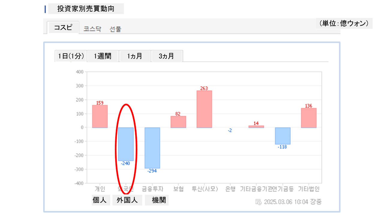 個人投資家は「159億ウォン」の買い越し。一方の外国人投資家は「240億ウォン」の売り越しです。