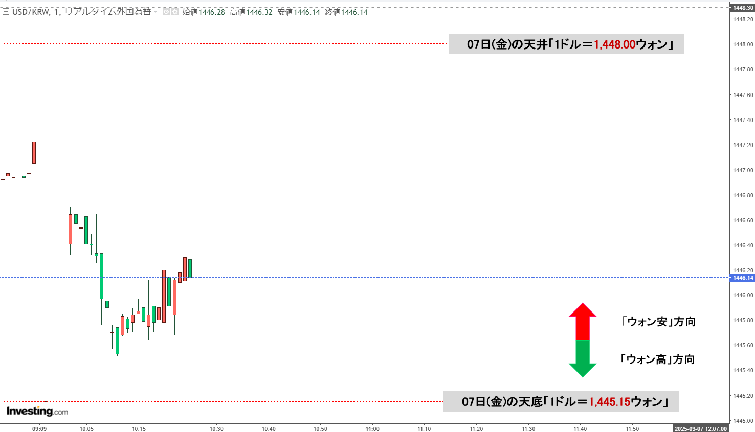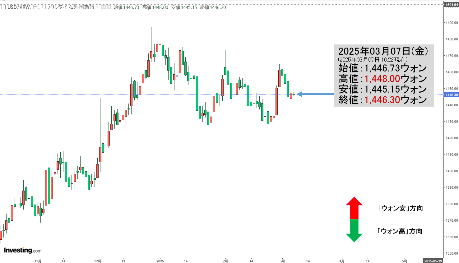 2025年03月07日(金)15:30現在、ドルウォンのチャートは以下のようになっています(チャートは『Investing.com』より引用)。まあ上がりません。現在のところ「1ドル=1,445ウォン」近辺の攻防となっています。ローソク足1...