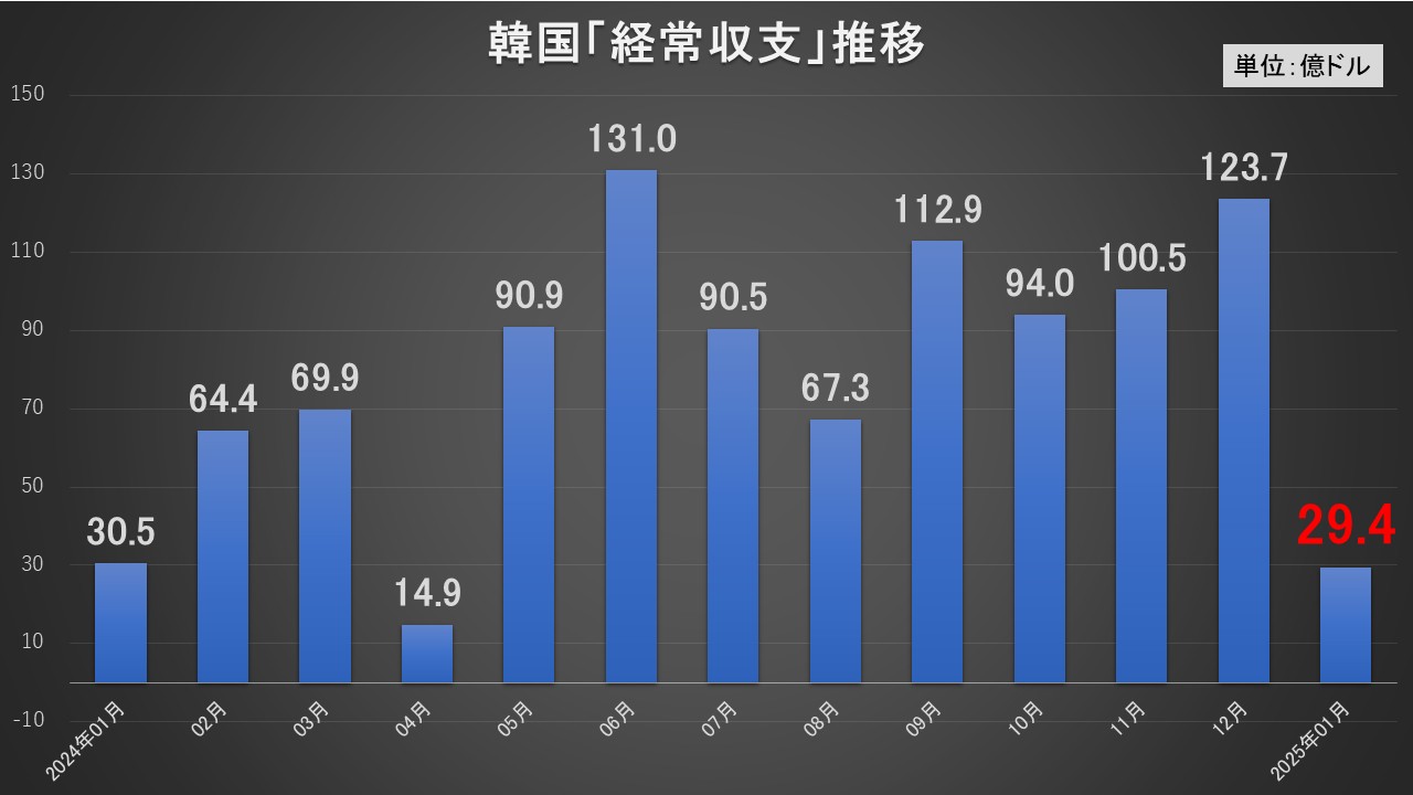 前月(2024年12月)が123.7億ドルありましたから、2025年01月の経常収支は対前月比で76.2%も減少しました。韓国の経常収支は01月は小さくなるものですが、ちょっと減りすぎではないのか――です。実際、2024年01月の「30.5億ドル」の下をくぐっています。