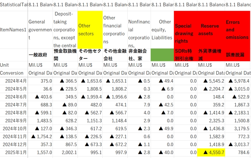 ↑黄色のマーカーが2025年01月の「外貨準備の増減」。