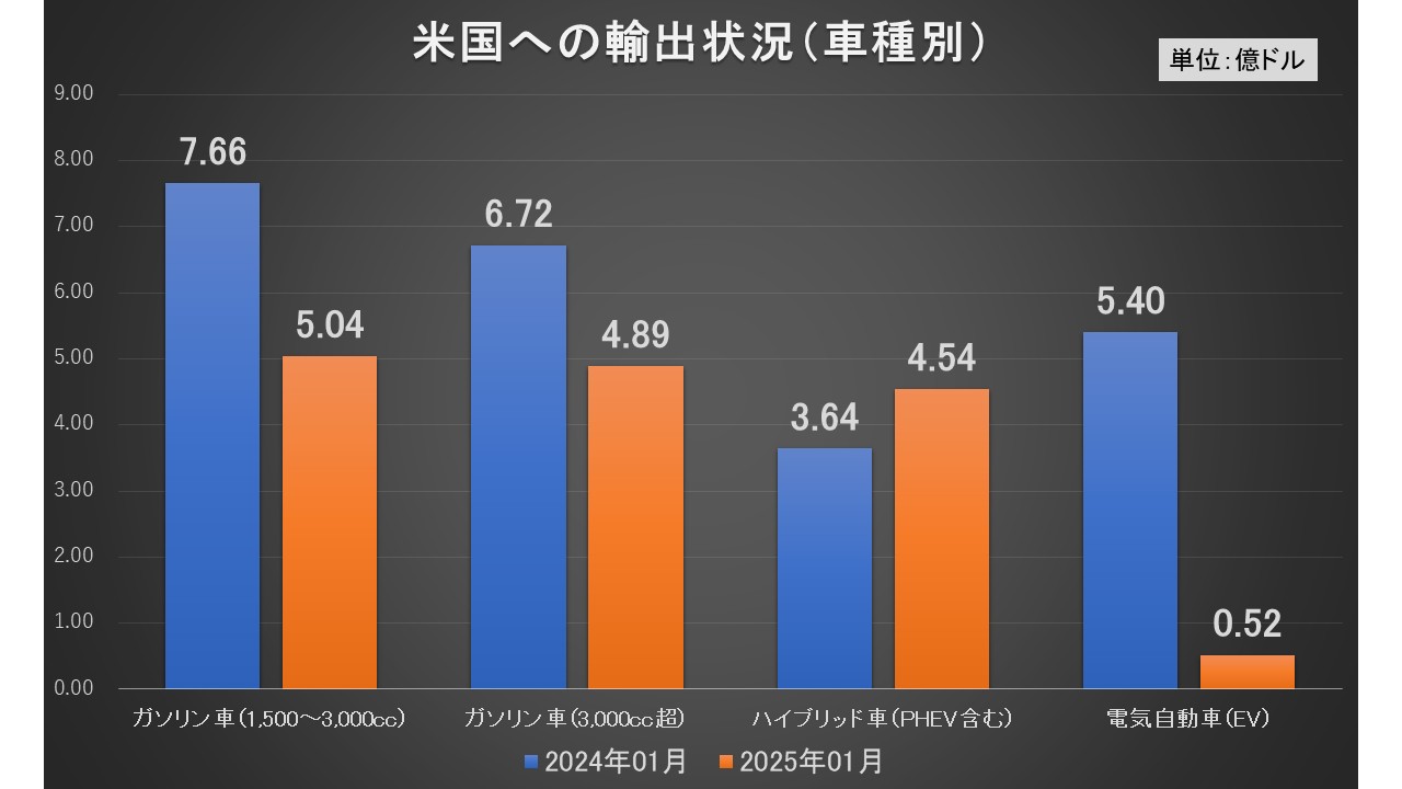 2024年01月と2025年01月の対合衆国輸出金額を車種別に見たものですが、オレンジの棒(2025年01月)が昨年同期を上回っているのは、ハイブリッド車だけです。