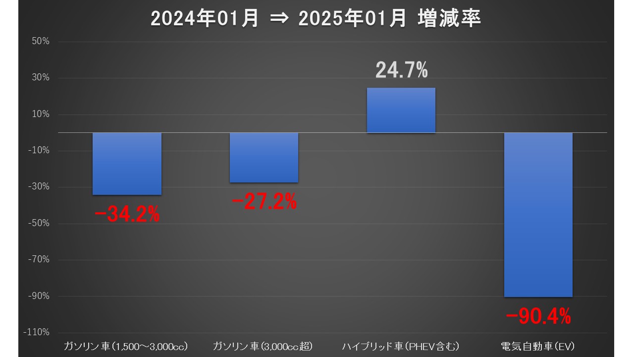ハイブリッド車だけが24.7%増加していますが、他は大きく減少しており、特に電気自動車(EV)は90.4%も減少しているのです。