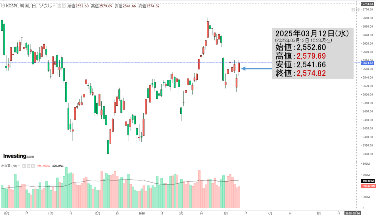 2025年03月12日(水)の韓国株式市場が締まりました。15:33現在、KOSPI(韓国総合株価指数)のチャートは以下のようになっています(チャートは『Investing.com』より引用)。