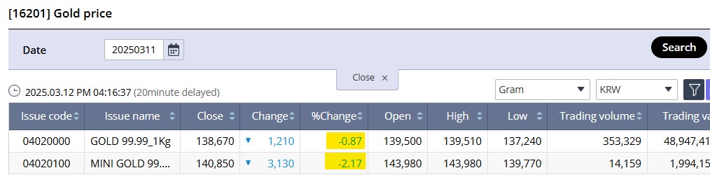 ↑2025年03月11日、金価格が「0.87%」下落。価格は「13万8,670ウォン」です。データ出典は「KRX」