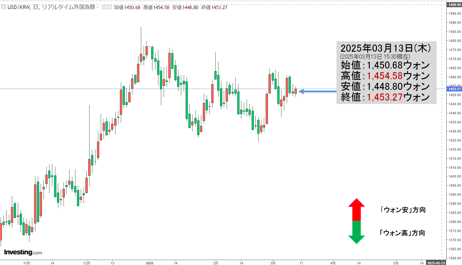 現在のところ「1ドル=1,453ウォン」近辺の攻防となっています。
