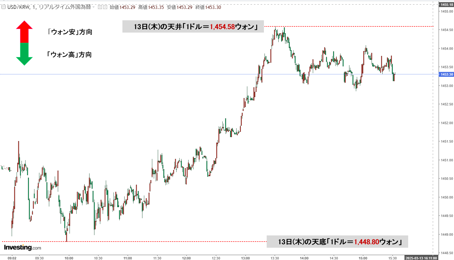 2025年03月13日(木)15:30現在、ドルウォンのチャートは以下のようになっています(チャートは『Investing.com』より引用)。