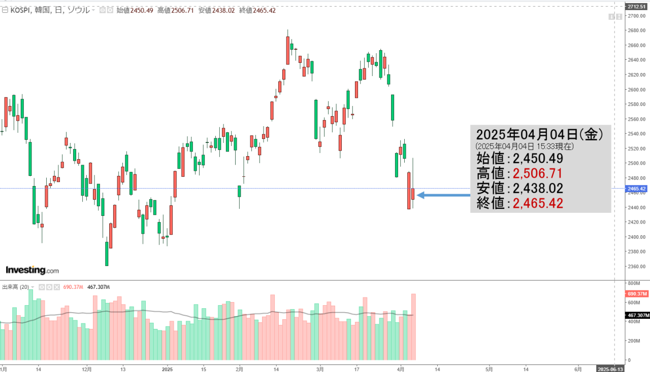 2025年04月04日(金)の韓国株式市場が締まりました。15:33現在、KOSPI(韓国総合株価指数)のチャートは以下のようになっています(チャートは『Investing.com』より引用)。