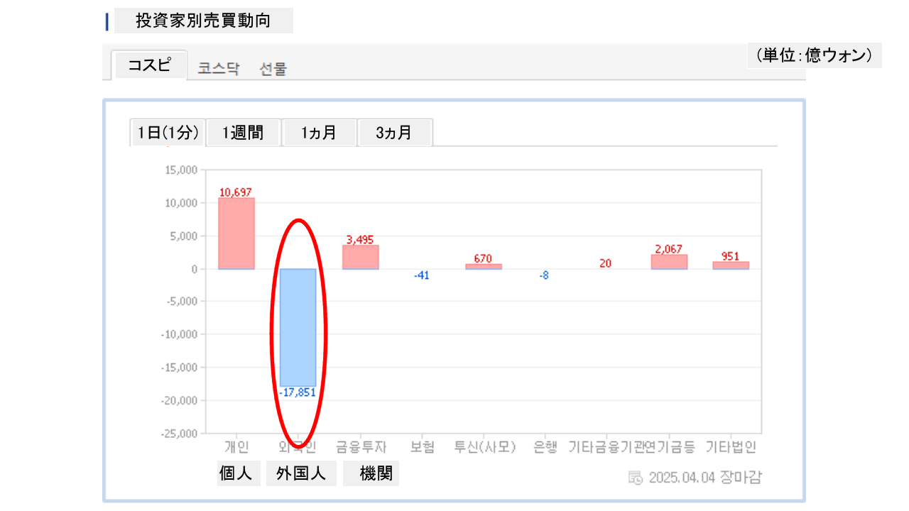 個人投資家は「1兆697億ウォン」の買い越し。一方の外国人投資家は「1兆7,851億ウォン」の売り越しです。