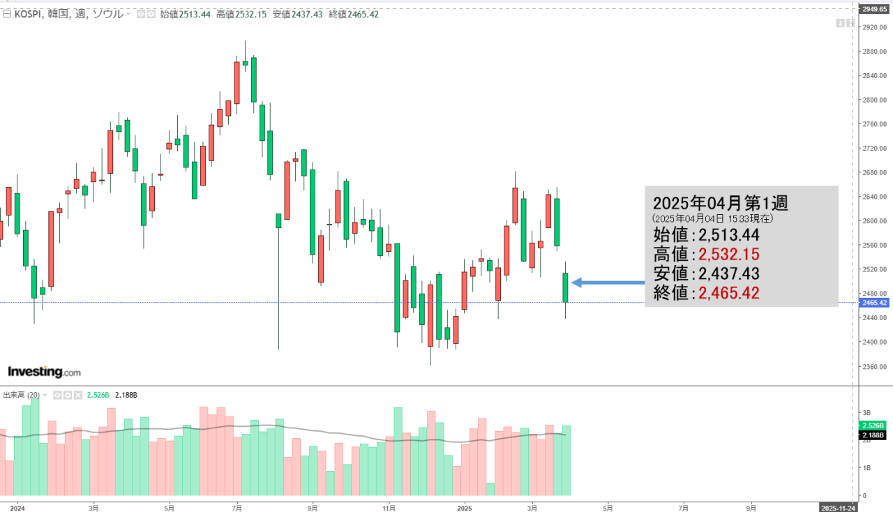 ローソク足の上が大きく削られました。KOSPIは「2,465」まで下落しています。