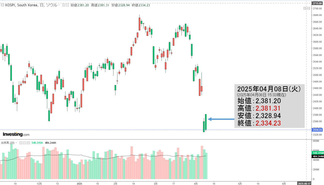 2025年04月08日(火)の韓国株式市場が締まりました。15:33現在、KOSPI(韓国総合株価指数)のチャートは以下のようになっています(チャートは『Investing.com』より引用)。
