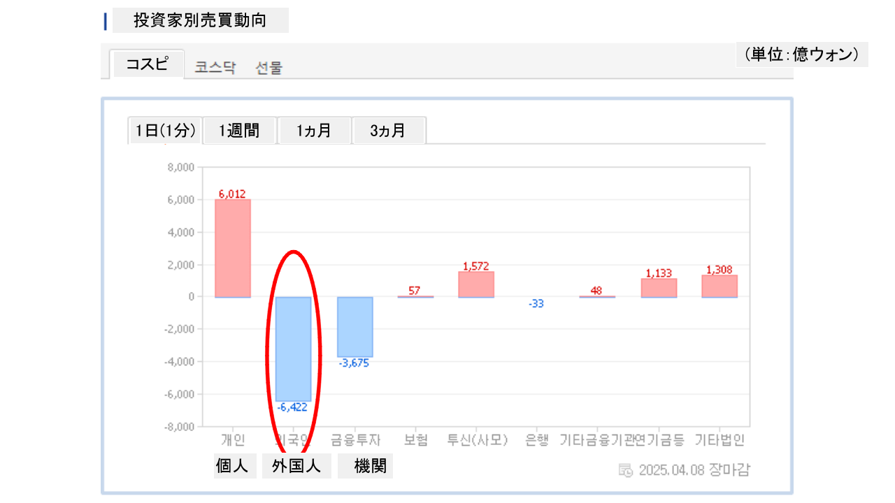 個人投資家は「6,012億ウォン」の買い越し。一方の外国人投資家は「6,422億ウォン」の売り越しです。