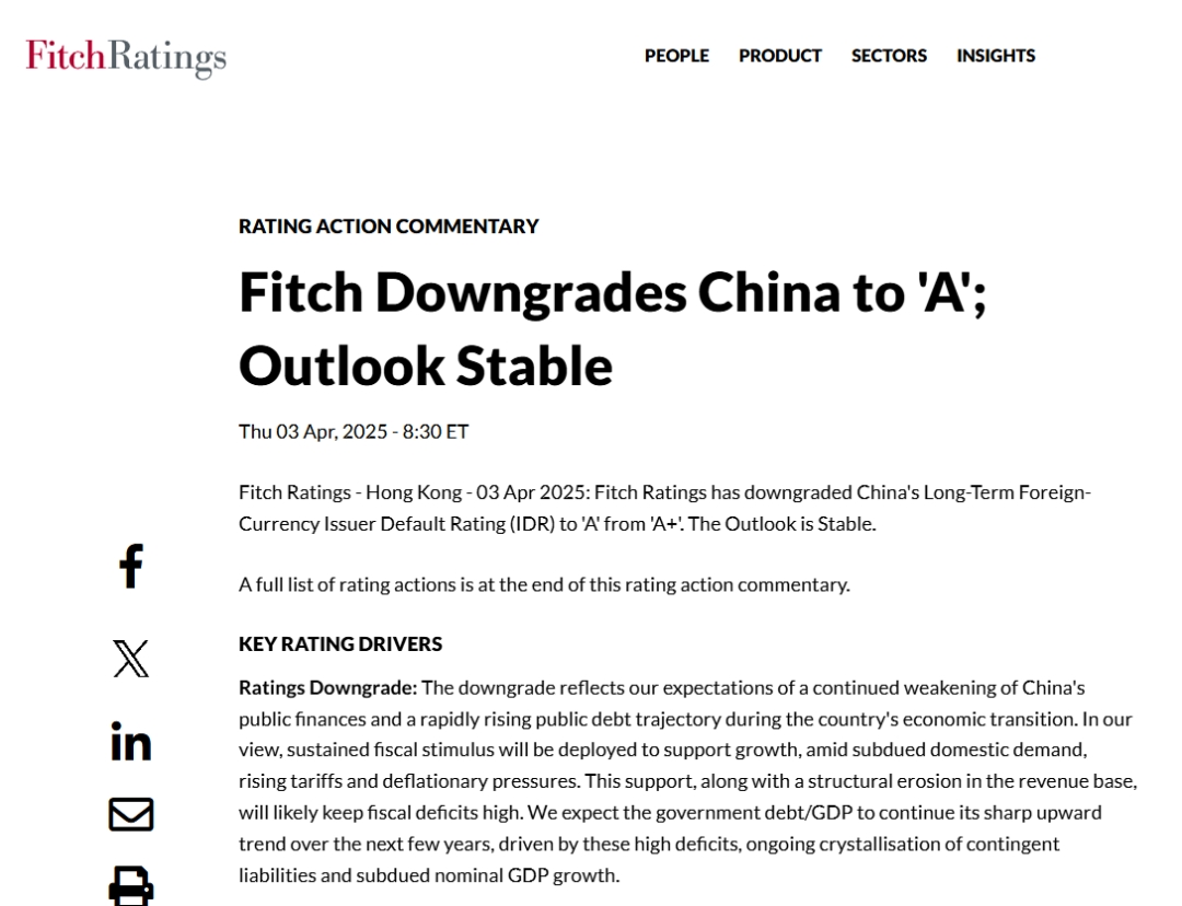 2025年04月03日、世界的格付け会社『Fitch(フィッチ)』は中国の格付けを引き下げた――と公表しました。