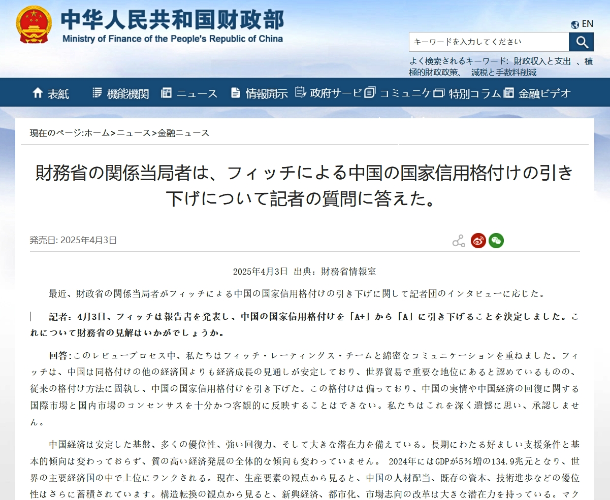 04月03日、『Fitch(フィッチ)』が報告書を発表し、中国の主権信用格付けを「A+」から「A」に引き下げました。これについて財政部の見解をお聞かせください。回答: