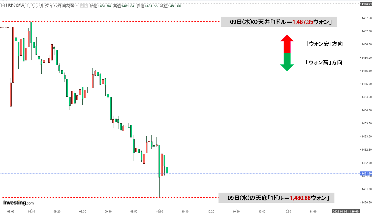 2025年04月09日(水)の市場が開きました。10:00現在、ドルウォンのチャートは以下のようになっています(チャートは『Investing.com』より引用:以下同)。