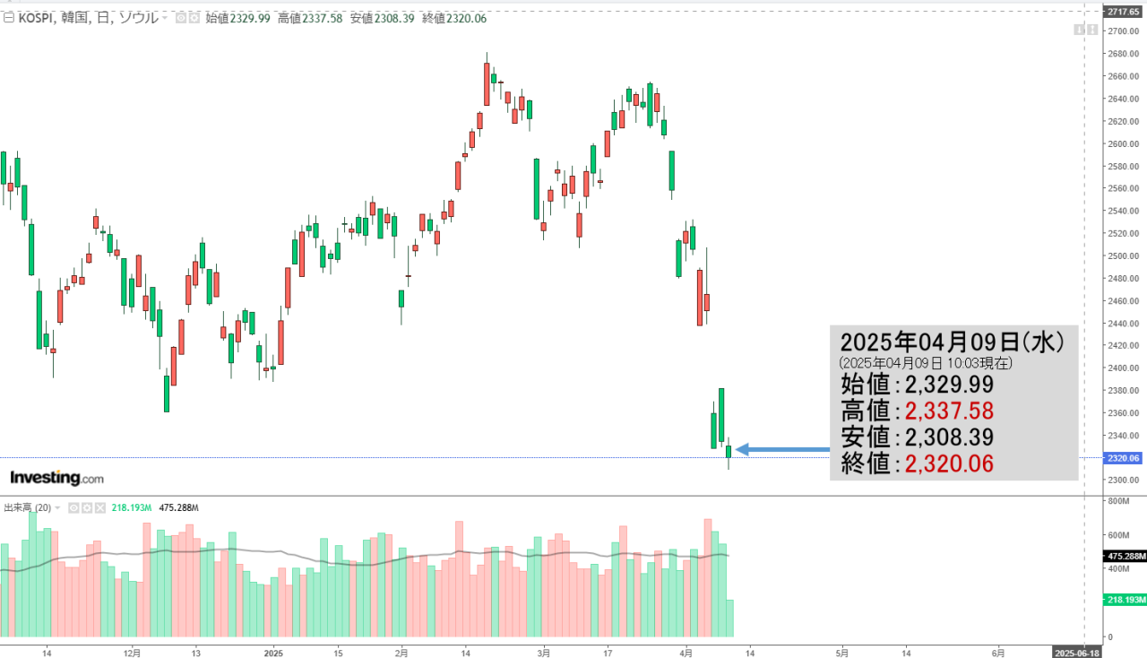 2025年04月09日(水)の韓国株式市場が締まりました。15:40現在、KOSPI(韓国総合株価指数)のチャートは以下のようになっています(チャートは『Investing.com』より引用)。初動の記事で「2,300を割るかもしれません」...
