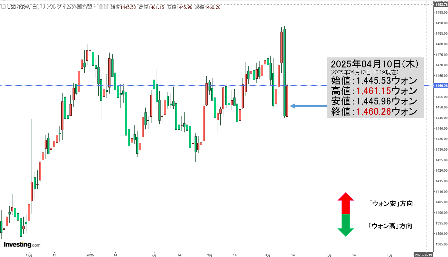 2025年04月10日(木)15:30現在、ドルウォンのチャートは以下のようになっています(チャートは『Investing.com』より引用)。一応まだ陽線です。現在のところ「1ドル=1,457ウォン」近辺の攻防となっています。ローソク足1...