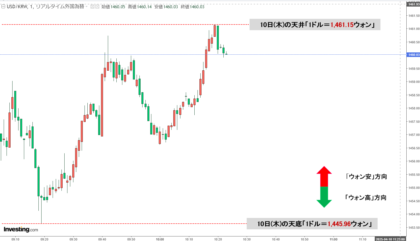 本日は現在のところ陽線。「1ドル=1,460ウォン」近辺の攻防となっています。