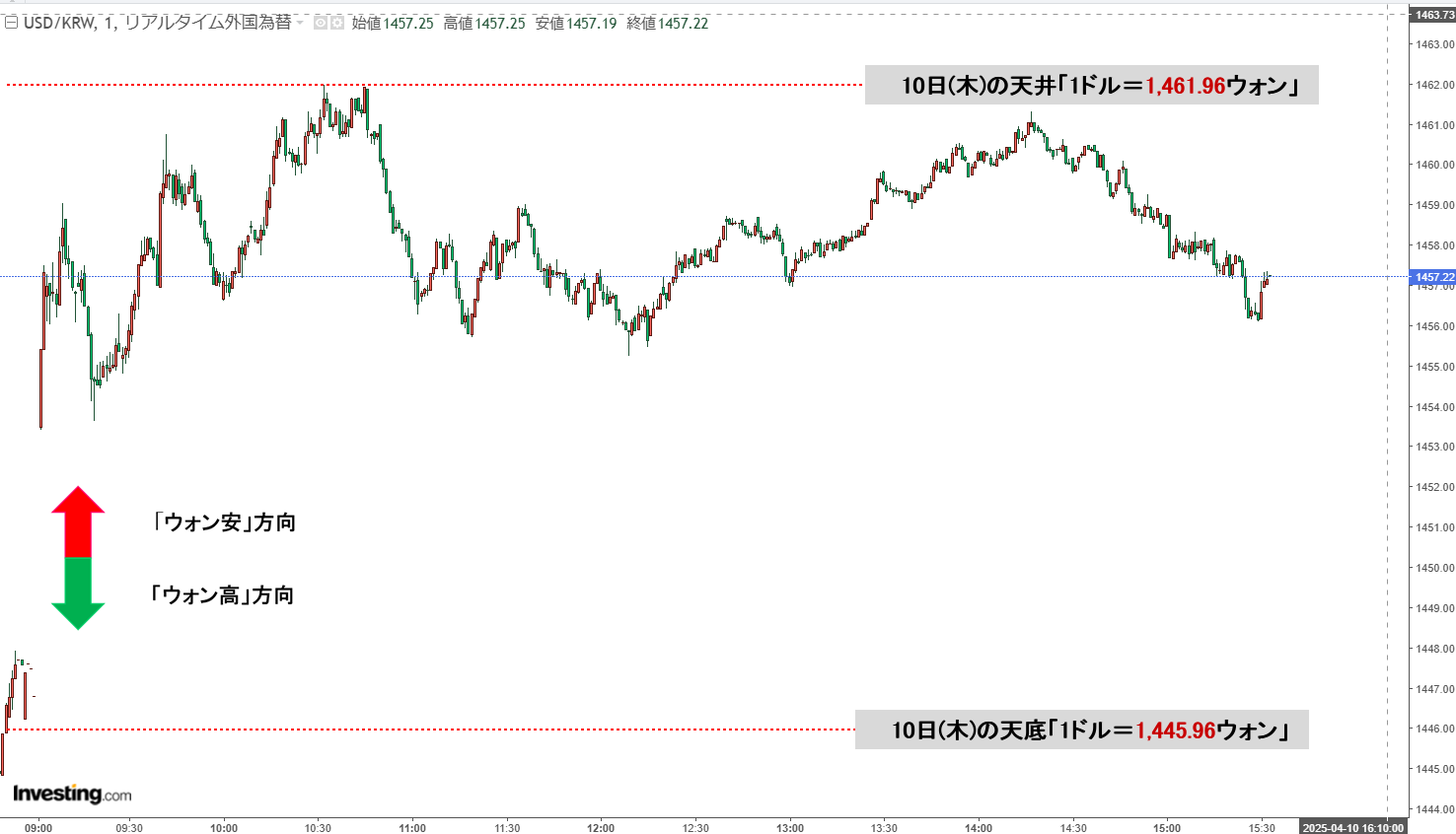 2025年04月11日(金)の市場が開きました。10:14現在、ドルウォンのチャートは以下のようになっています(チャートは『Investing.com』より引用)。すごくドタバタのプライスアクションになっており、本日は現在のところ陰線。「1...