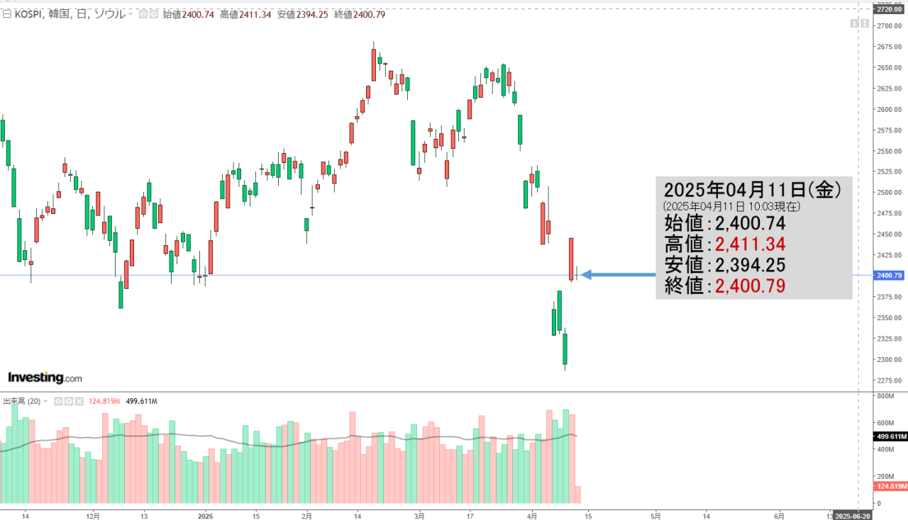 2025年04月11日(金)の韓国株式市場が開きました。10:03現在、KOSPI(韓国総合株価指数)のチャートは以下のようになっています(チャートは『Investing.com』より引用)。