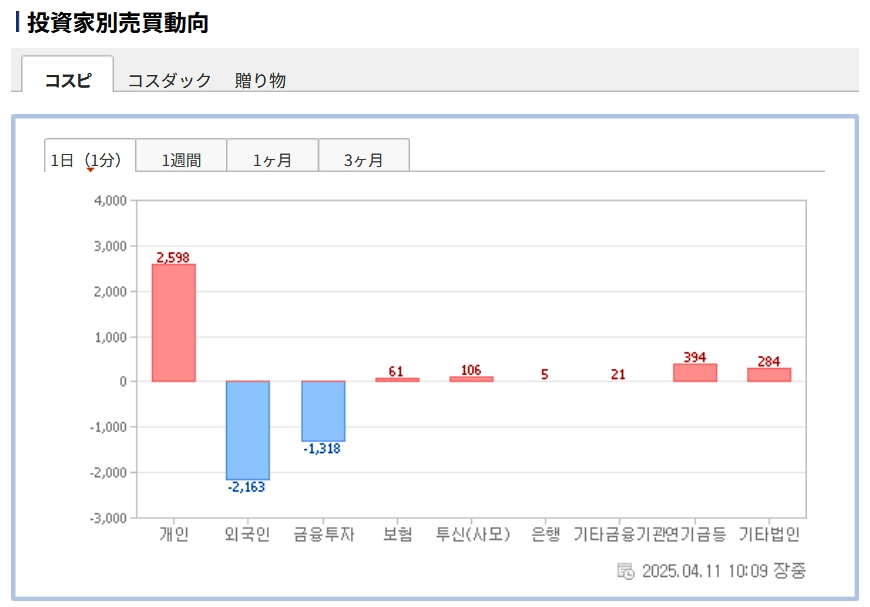 個人投資家は「2,598億ウォン」の買い越し。一方の外国人投資家は「2,163億ウォン」の売り越しです。